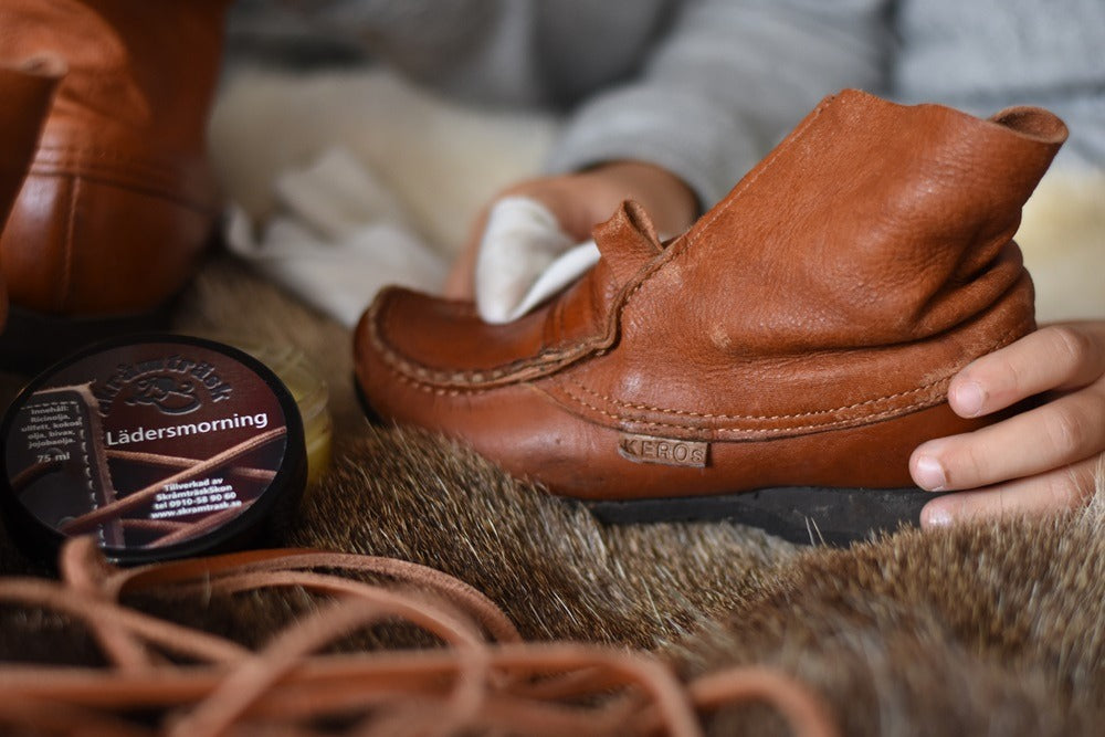 Smörj ett tunt lager några gånger/år eller vid behov. Bivaxbaserad ofärgad smorning som rekommenderas till bl a färgade näbbskor.